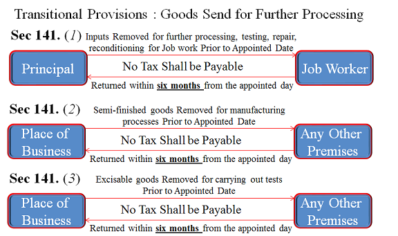 Inputs as such or partially processed inputs which are sent to a job worker prior to introduction of GST under the provisions of existing law [Central Excise] and if such goods are returned within 6 months from the appointed day i.e. 1st July, 2017 no tax would be payable. If such goods are not returned within prescribed time, the input tax credit availed on such goods will be liable to be recovered.