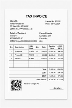 | Recipient Information | Name, address, and GSTIN (if registered); for B2C > ₹50,000, add place of supply with state and code |