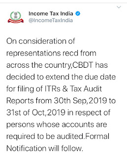 Last night, the CBDT tweeted: “On consideration of representations recd from across the country, CBDT has decided to extend the due date for filing of ITRs & Tax Audit Reports from 30th Sep, 2019 to 31st of Oct, 2019 in respect of persons whose accounts are required to be audited.formal Notification will follow.