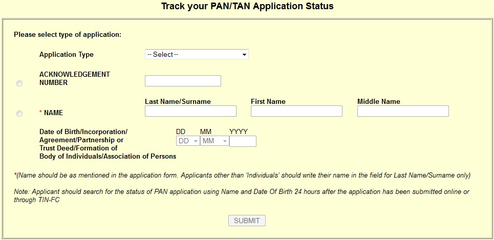 You can also check the status of the application by quoting acknowledgement number at https://tin.tin.nsdl.com/pantan/StatusTrack.html. See the image below